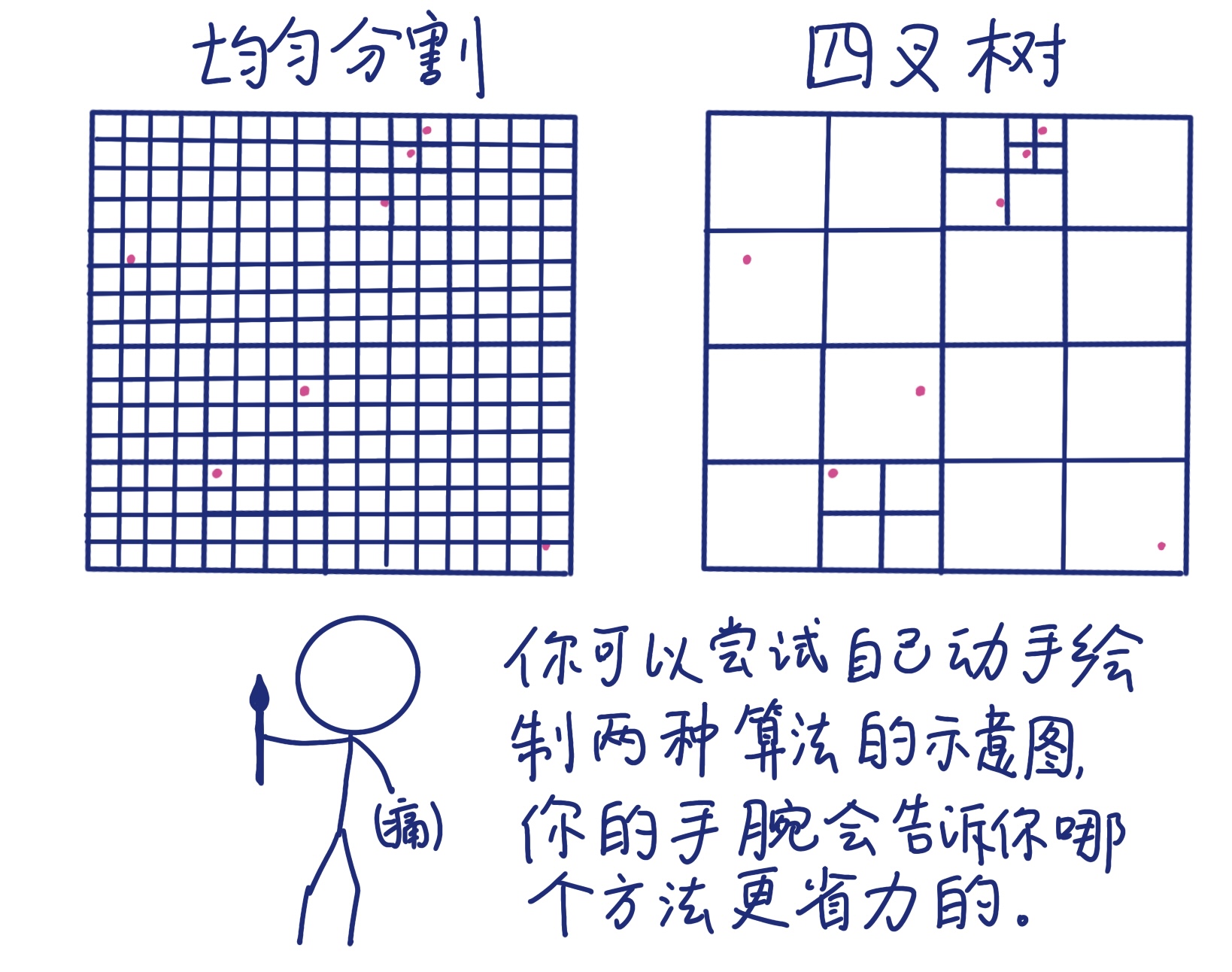 我们模拟关注的重点其实是粒子附近的小区域,而非那些“空”的区域。如果我们把二维模拟区域完全均匀分割, 直到分割单元内粒子数小于等于一,然后再计算粒子间相互作用,就会很费时间。